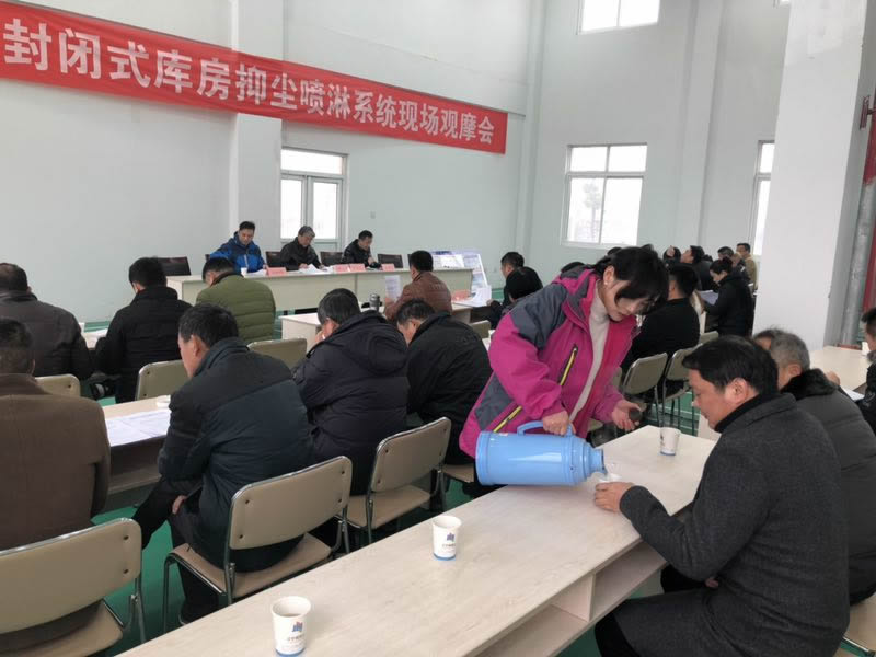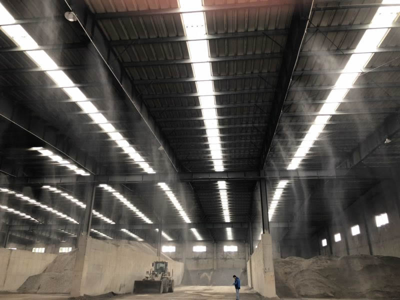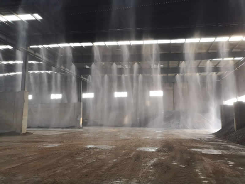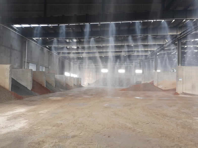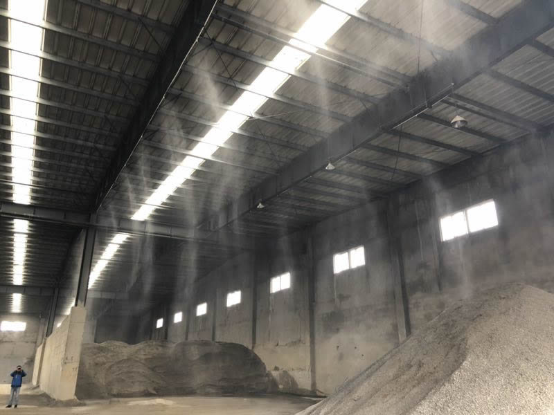 2)工作原理,高壓泵從貯水池內抽水,經過三道過濾網(wǎng),再經高壓管道至高壓噴嘴霧化,霧化后打出2-6微米的微細氣霧進入整個料倉作業(yè)空間,單一噴嘴產生的氣霧寬1-1.5米,這些微小的霧化顆粒能長時間懸浮在空氣中和空氣中的浮塵顆粒結合落入地面。全面達到除塵、地面保濕的效果。其中還有一個功效,夏天料倉內溫度高達40度,作業(yè)人員在此作業(yè)工作環(huán)境惡劣,打開噴淋后能大大降低料倉溫度及降低原材料的溫度。